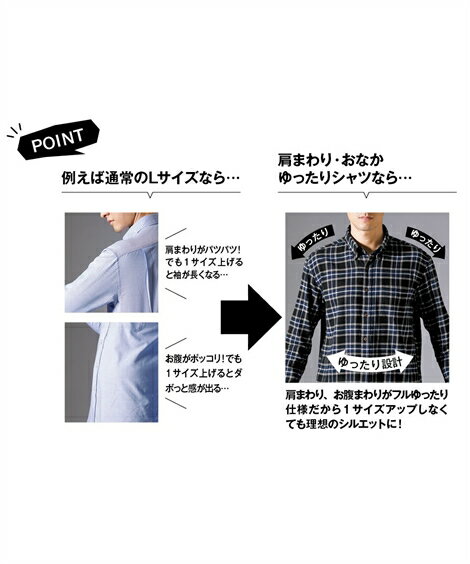 おなかぽっこりが気になる方に着てほしい! ビエラ起毛チェック柄長袖ボタンダウンシャツ(肩まわり・おなかゆったり) M-10L 大きいサイズ メンズ ニッセン 黒×白系 白×ワイン系 ネイビー×ブルー系 赤×ネイビー系 グリーン×ネイビー系 黒×ネイビー系 カラー 黒×白系/白×ワイン系/ネイビー×ブルー系/赤×ネイビー系/グリーン×ネイビー系/黒×ネイビー系 サイズ M/L/LL/3L/4L/5L/6L/7L/8L/10L 実寸(cm) M:胸囲:114,肩幅:50,袖丈:59,着丈:72L:胸囲:120,肩幅:51,袖丈:60.5,着丈:74LL:胸囲:126,肩幅:53,袖丈:61.5,着丈:763L:胸囲:132,肩幅:54,袖丈:62,着丈:804L:胸囲:138,肩幅:55,袖丈:62.5,着丈:815L:胸囲:144,肩幅:57,袖丈:62.5,着丈:816L:胸囲:150,肩幅:58,袖丈:63,着丈:827L:胸囲:156,肩幅:60,袖丈:63,着丈:828L:胸囲:162,肩幅:61,袖丈:63.5,着丈:8310L:胸囲:174,肩幅:64,袖丈:64,着丈:84 備考 ※商品サイズは、仕上がりサイズです。