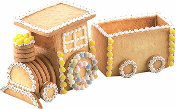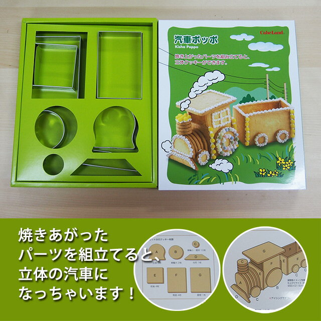 ボクがだーいすきな 汽車のクッキーが 出来上がる抜き型セットだよ! 焼きあがったパーツを 立てると、立体の汽車に なっちゃいます。